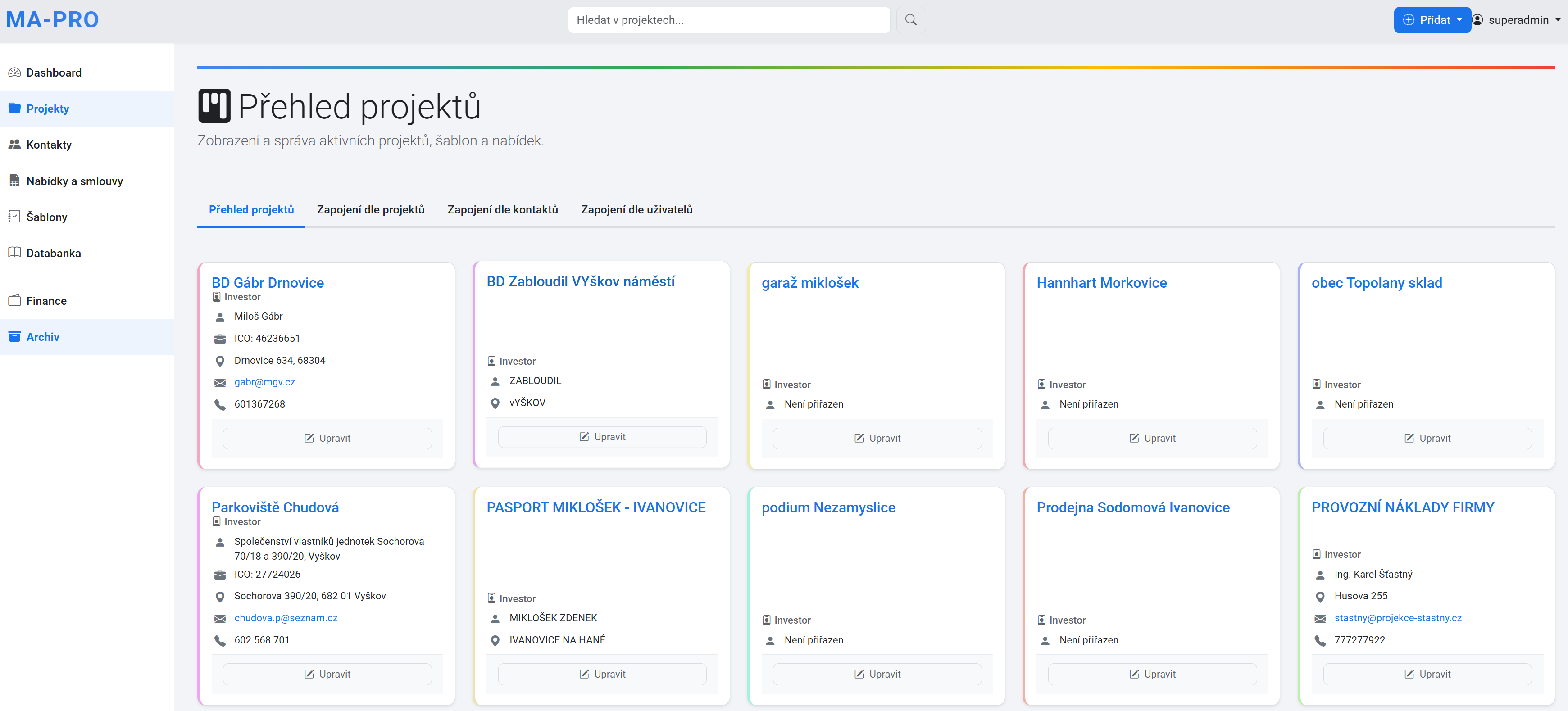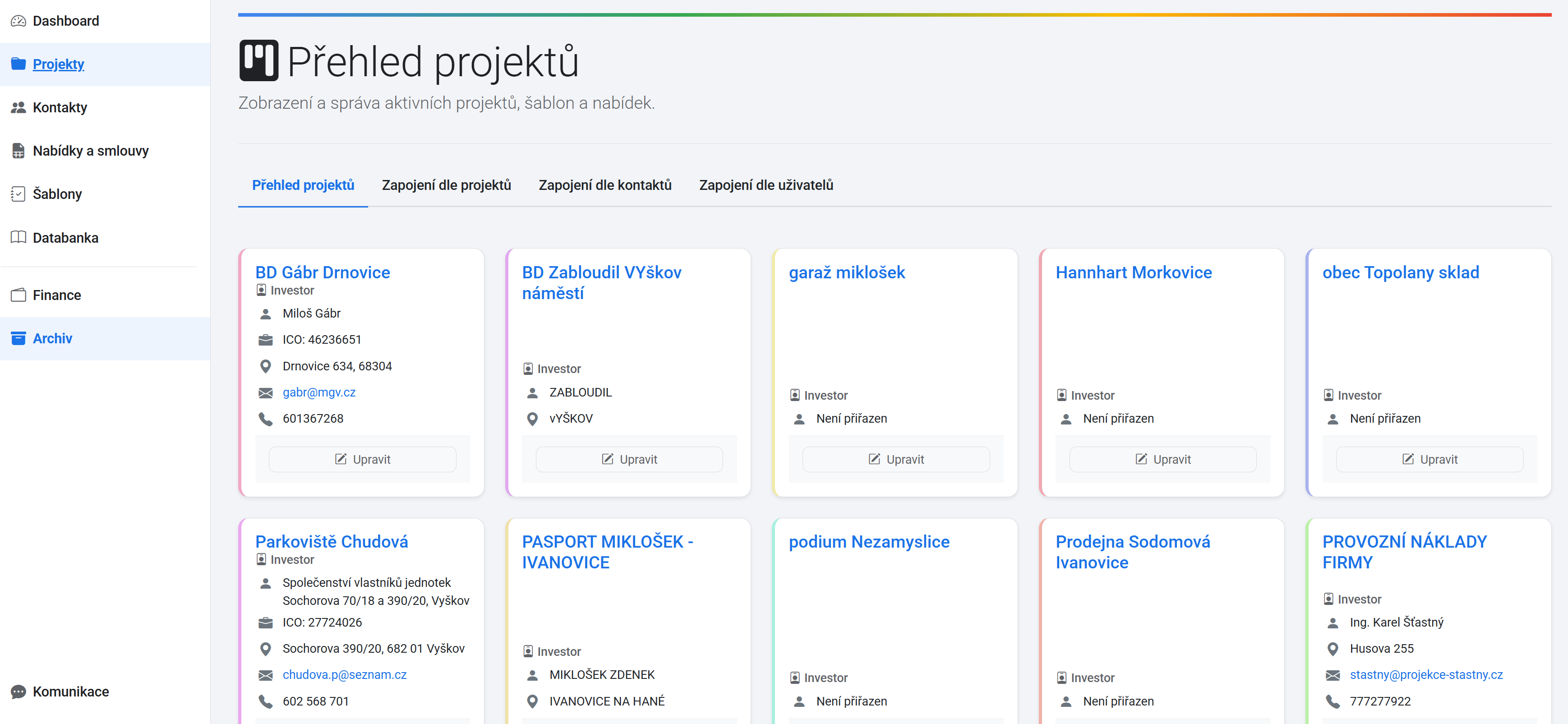 Modul kontaktů zajišťuje centralizovaný přehled všech osob zapojených do projektů, ať už jde o investory či spolupracovníky. Jednou uložené údaje lze snadno propojit s novými projekty, takže vždy víte, kdo je součástí týmu a na jakých úkolech pracuje. Integrovaný systém sdílení dokumentů prostřednictvím cloudového úložiště pak umožňuje efektivní výměnu informací a plynulou spolupráci..