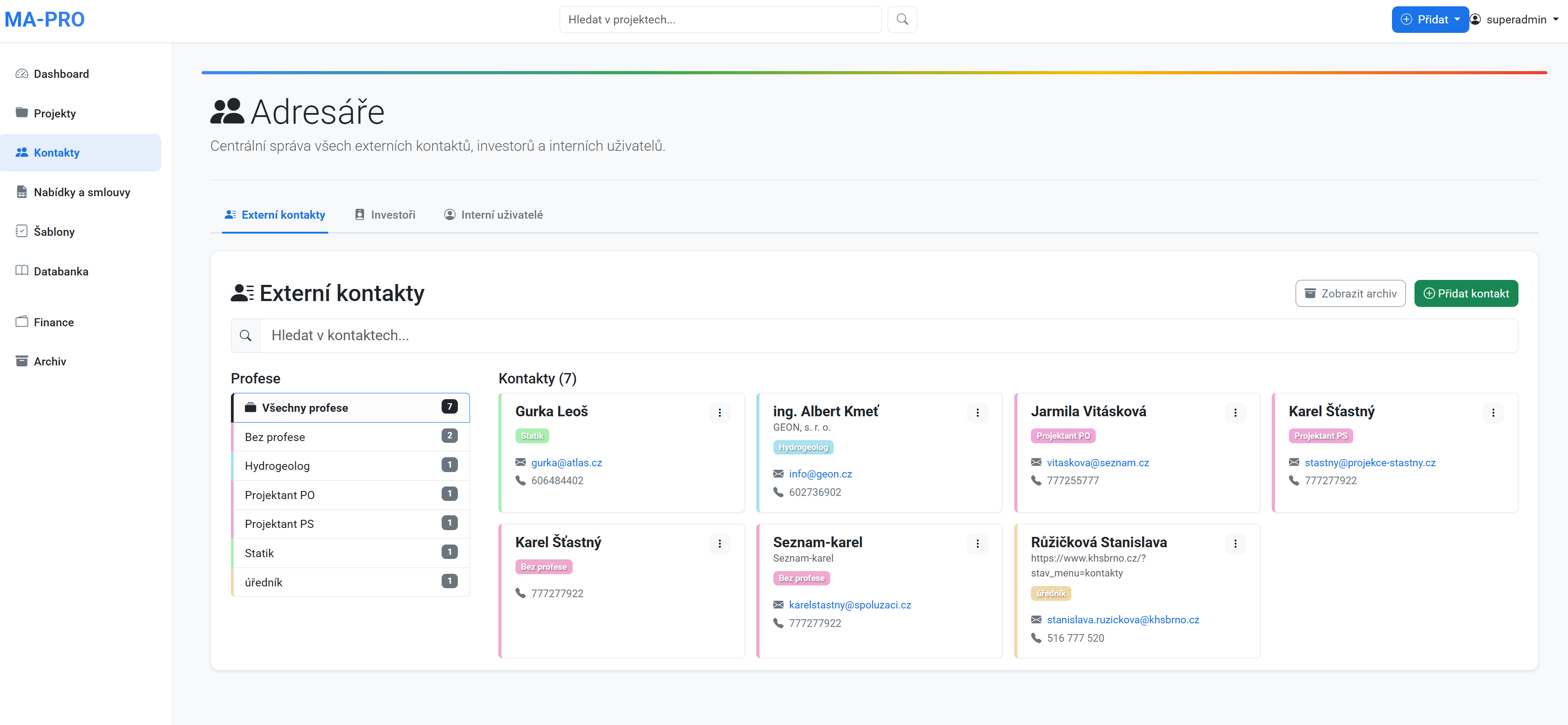 Jsem Karel Šťastný, zakladatel MA-PRO. Za více než 25 let v projekční praxi, kterou jsem začal na Stavební fakultě VUT v Brně, jsem pochopil, že úspěch zakázky nestojí jen na kvalitním technickém řešení, ale i na jasně nastavených procesech a koordinaci týmu. Proto vzniklo MA-PRO – MAnažer PROjekce. Z původního interního nástroje se stala platforma vytvořená na míru architektům a projektantům, která sjednocuje řízení projektů, komunikaci i dokumentaci do jednoho přehledného místa.