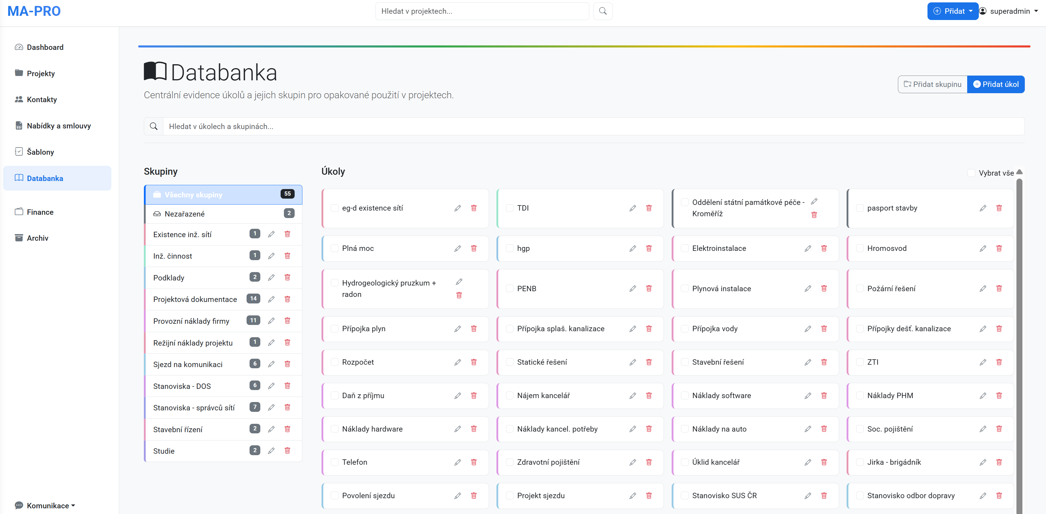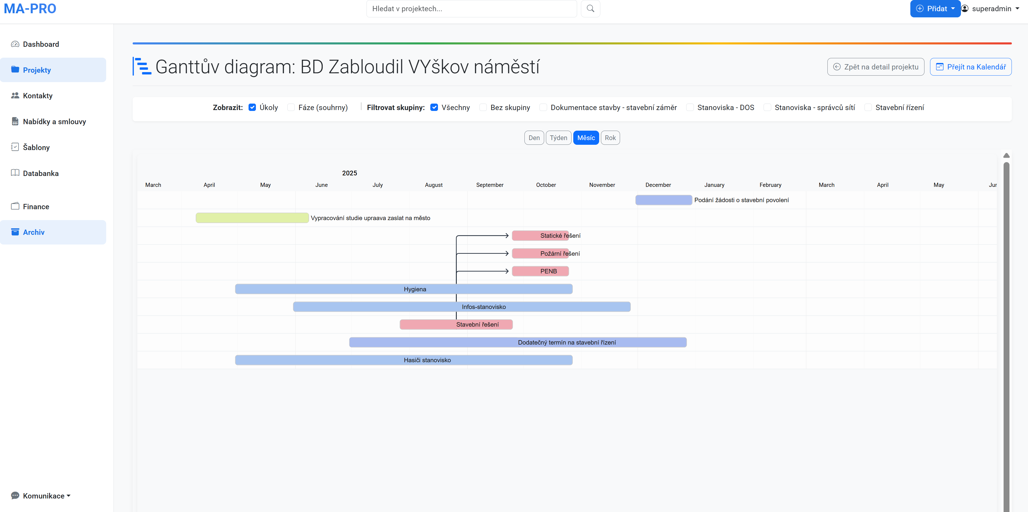 MA PRO je česká webová aplikace vytvořená projektantem pro projektanty. Je určená pro živnostníky, malé i střední firmy. Propojuje řízení projektů, týmovou spolupráci a finanční kontrolu do jednoho přehledného celku. Získejte zpět kontrolu nad svými projekty.